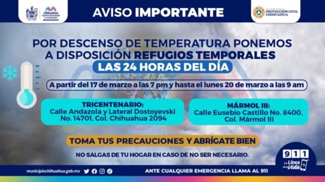 El Gobierno Municipal de Chihuahua, a través de la Coordinación de Protección Civil, informa que ante el descenso de las temperaturas y presencia de lluvias, los dos refugios temporales, ubicados al norte y al sur de la ciudad, permanecerán abiertos las 24 horas hasta la mañana del lunes 20 de marzo.