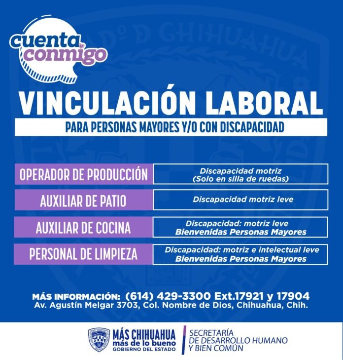 La Secretaría de Desarrollo Humano y Bien Común informó sobre la apertura de nuevas vacantes laborales dirigidas a personas con discapacidad y personas adultas mayores en la ciudad de Chihuahua, como parte de las acciones orientadas a fortalecer la inclusión laboral.
