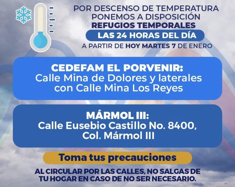 Ante las bajas temperaturas la Coordinación Municipal de Protección Civil, solicita a la ciudadanía a reportar al 9-1-1 a personas durmiendo en la vía pública para ser canalizadas a uno de los dos refugios, uno ubicado en la el CEDEFAM El Porvenir al norte de la ciudad en calle Mina de Dolores y laterales con calle Mina Los Reyes; y el centro comunitario Mármol III al sur de la Capital entre las calles Eusebio Castillo y Ernesto Malda.