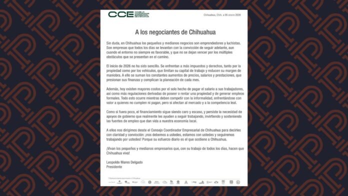 El presidente del Consejo Coordinador Empresarial Chihuahua, Leopoldo Mares, envió un mensaje en el que expuso que el inicio de 2026 representará mayores cargas fiscales y derechos por propiedad y vehículos para los pequeños y medianos negocios, lo que impactará su capital de trabajo.