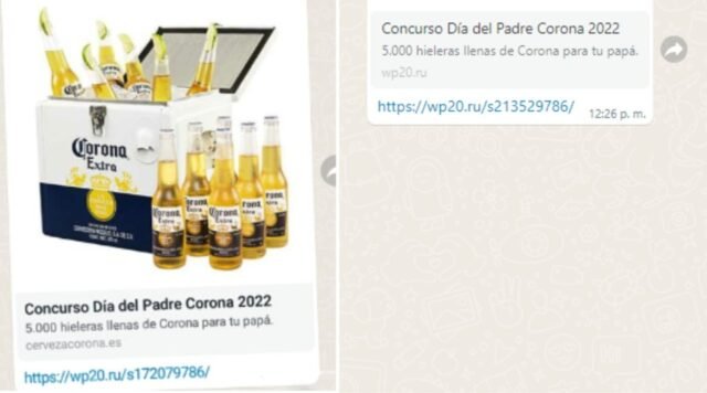 Los «ciberdelincuentes» se hacen pasar por la empresa Corona y piden a las víctimas registrarse para un concurso de una hielera en conmemoración del Día del Padre, por lo cual envían el enlace https://wp20.ru/s172079786/ el cual redirige a una pantalla en la que se solicita el ingreso de datos personales y al dar clic en «enviar« se da el robo de información.