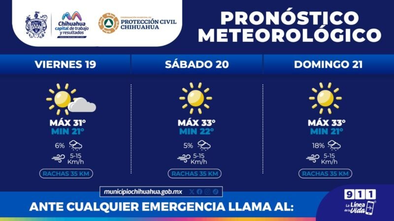 La Coordinación Municipal de Protección Civil, informa que este fin de semana, del 19 al 21 de julio, se prevén temperaturas máximas de 33°C y mínimas de 21°C.