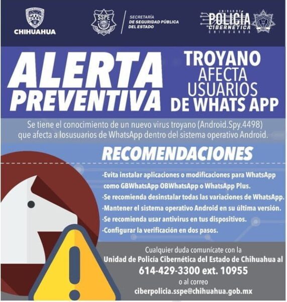 Derivado de los análisis de la Dirección de Policía Cibernética de la Secretaría de Seguridad Pública del Estado (SSPE), se detectó un virus troyano que afecta el programa de mensajería Whatsapp.
