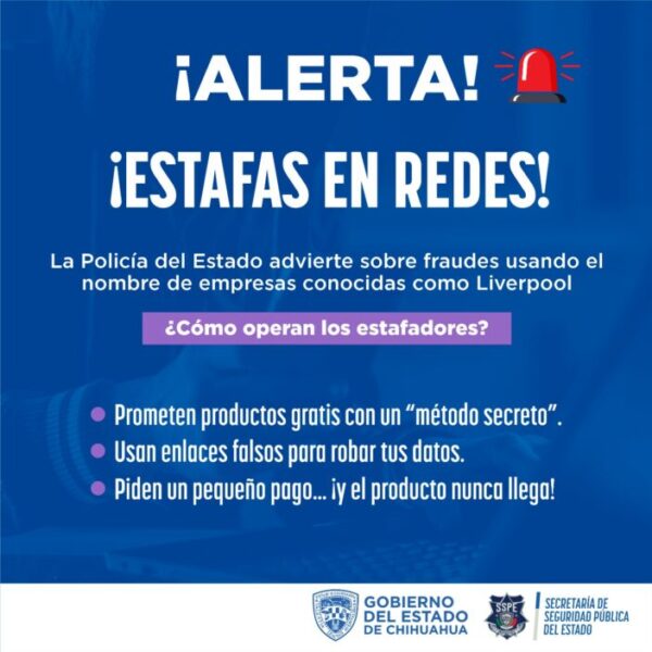 La Secretaría de Seguridad Pública del Estado (SSPE) advierte a la ciudadanía sobre una nueva estafa detectada en redes sociales, en la que delincuentes utilizan el nombre de empresas reconocidas y tiendas departamentales de renombre, para engañar a usuarios con supuestas promociones.