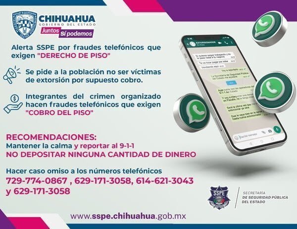 Chihuahua, Chih.- La Secretaría de Seguridad Pública del Estado (SSPE) a través del Centro de Comando, Control, Comunicación y Cómputo (C4), alertó a la ciudadanía para que evite ser víctima de extorsión telefónica y omita hacer depósitos de dinero a delincuentes que a través de llamadas exigen pagos por “derecho de piso”.