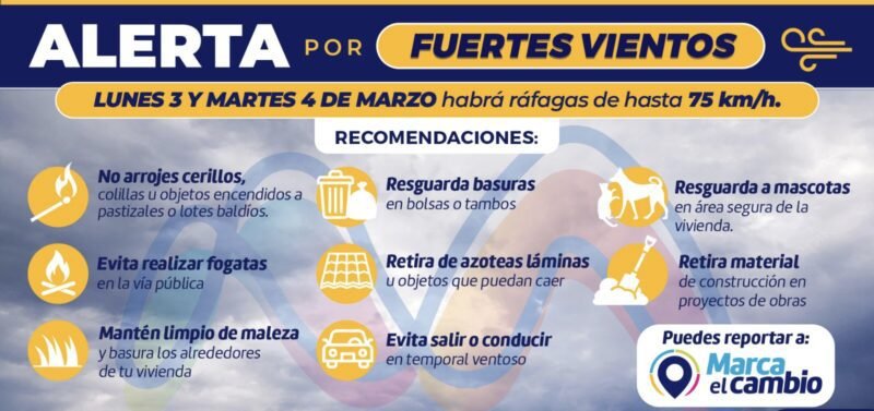 La Coordinación Municipal de Protección Civil, advierte a la población que entre los días 3 y 4 de marzo se estiman ráfagas de viento de hasta 75 kilómetros por hora, con base a la información referida por el Sistema Meteorológico Nacional, por lo que se exhorta a la población a tener las precauciones para salvaguardar su integridad.
