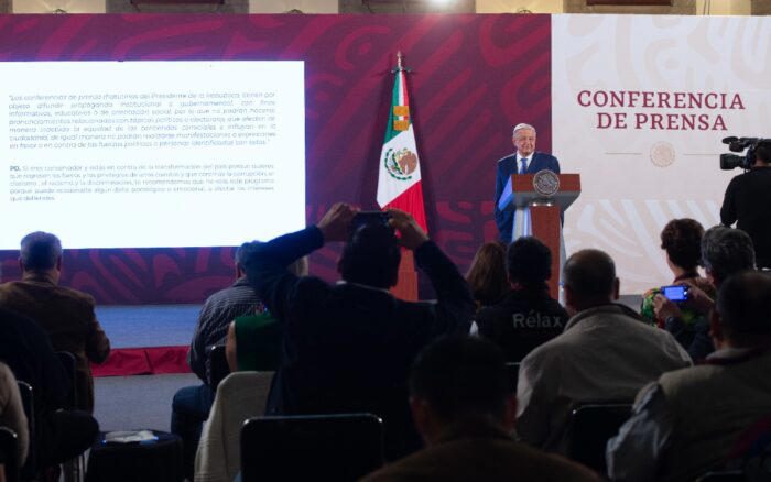 El jueves, la Comisión de Quejas y Denuncias del INE ordenó a AMLO que colocara al inicio de sus ruedas de prensa diarias un mensaje que advierta que no puede pronunciarse sobre temas electorales.