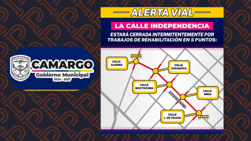 El Gobierno Municipal de Camargo informa a la ciudadanía que la calle Independencia será cerrada intermitentemente debido a trabajos de rehabilitación en cinco puntos clave. Estas labores forman parte de las acciones de mejora en la infraestructura vial, con el objetivo de brindar calles más seguras y en mejores condiciones para todos.