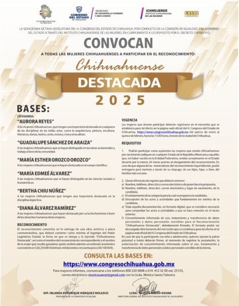 La convocatoria está dirigida a las personas que siendo chihuahuenses por nacimiento radiquen en cualquier Estado de la República Mexicana y aquellas que, sin haber nacido en la Entidad residan actualmente durante por lo menos 24 meses previos al otorgamiento del reconocimiento. El registro inicia a partir del 15 de enero y hasta el 15 de febrero del 2025, hasta las 03:00 de la tarde, horario de la ciudad de Chihuahua, y podrán registrarse o postular a las participantes en la página del Congreso: https://www.congresochihuahua.gob.mx/