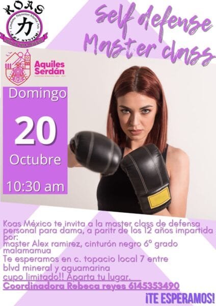 El Master Alex Ramírez cinturón negro sexto grado Malamamua por parte de Koas México impartirá el curso a mujeres a partir de los 12 años en un evento coordinado por Rebeca Reyes en Aquiles Serdán mientras que en Chihuahua será CUFISA el encargado bajo la misma dinámica.