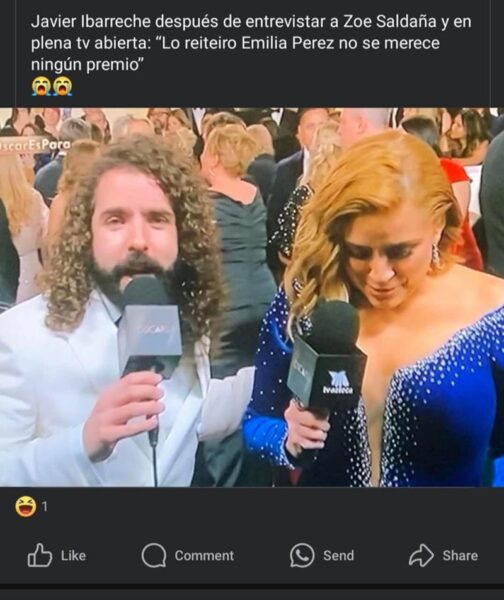 «Javier Ibarreche escupiendo a Emilia Pérez en la cara», «Sin pelos en la lengua», «Quiero mucho a Javier Ibarreche por odiar tanto a Emilia Pérez públicamente», «Javier Ibarreche se plantó ahí en la alfombra roja de los Oscars a tirar factos» y «Gracias a dios Javier Ibarreche está en la alfombra roja porque el sí sabe hacer preguntas de cine».