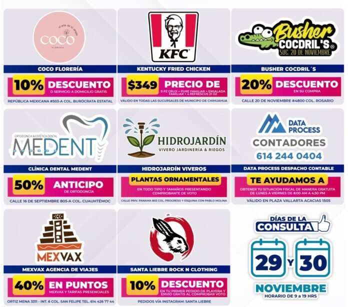 La jornada del Presupuesto Participativo 2026 se realizará este 29 y 30 de noviembre, donde las y los chihuahuenses podrán emitir su voto para elegir los proyectos de obra y mejora comunitaria que se financiarán con recursos municipales. El incentivo económico en comercios locales, aunque no oficial, se perfila como un complemento atractivo para impulsar una mayor movilización en las casillas.