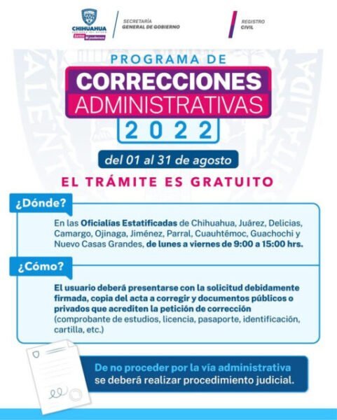 Chihuahua, Chih.- El Gobierno del Estado, a través de la Dirección General del Registro Civil, invita a las y los chihuahuenses a aprovechar durante todo el mes de agosto el “Programa de Correcciones Administrativas 2022” para la rectificación sin costo de datos en actas de todo tipo y así brindar certeza a la ciudadanía en la información asentada en las mismas.