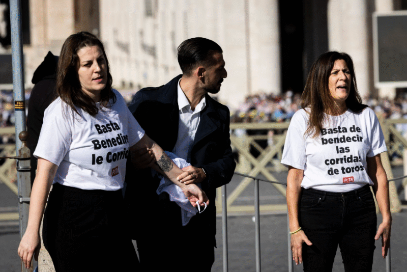 Ciudad del Vaticano – Simpatizantes de PETA, con camisetas que decían «¡Basta de bendecir las corridas de toros!» y sosteniendo una pancarta con la imagen de Jesús proclamando que torturar animales es un pecado, fueron detenidos frente a la Plaza de San Pedro durante el Jubileo de la Vida Consagrada, ante la mirada atónita de monjes, monjas y sacerdotes.