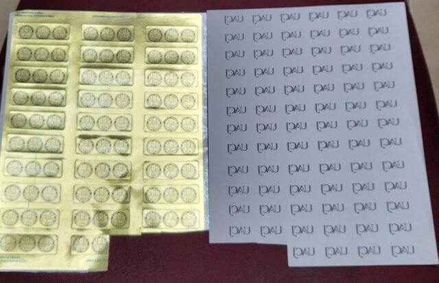 Además, un teléfono celular, tres hojas impresas con logotipos de la Universidad Tecnológica de Ciudad Juárez, una hoja de etiquetas adhesivas doradas con logotipo de la Universidad Autónoma de Ciudad Juárez y una hoja impresa con logotipo UACJ.