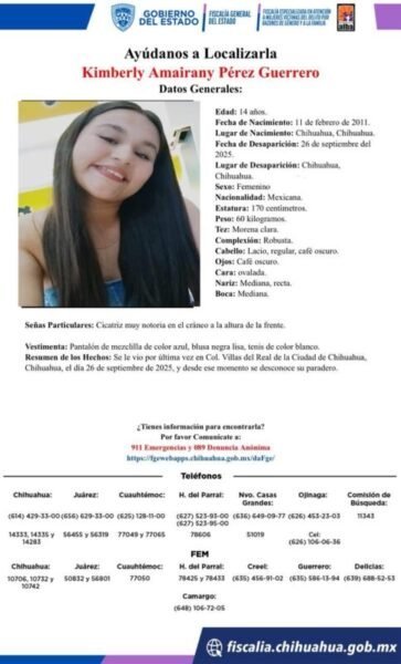 La Fiscalía General del Estado emitió una ficha de búsqueda para localizar a Kimberly Amairany Pérez Guerrero, de 14 años, quien desapareció el 26 de septiembre de 2025 en la ciudad de Chihuahua. De acuerdo con el reporte oficial, fue vista por última vez en la Colonia Villas del Real, y desde entonces se desconoce su paradero.