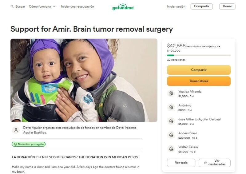 La familia se apoya en una colecta solidaria en línea a través de la plataforma GoFundMe, a la que se puede sumar cualquier persona con donaciones desde los 100 pesos. En dos semanas han logrado recaudar más de 40 mil pesos gracias a 22 aportaciones. La meta es llegar a los 400 mil pesos lo antes posible, para que el pequeño Amir pueda crecer sano junto a su hermano y sus padres.