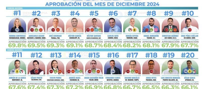 Aunque esta encuestadora, es representante de un medio nacional muy acérrimo al Gobierno Federal y a Morena, los números indican a Romina Contreras, alcaldesa de Huixquilucan en el Estado de México, quien representa al PAN; incluso otros alcaldes de diferentes partidos también están en la lista, como Adrián de la Garza, alcalde de Monterrey, Nuevo León, quien a pesar de la alianza, es más representativo del PRI.