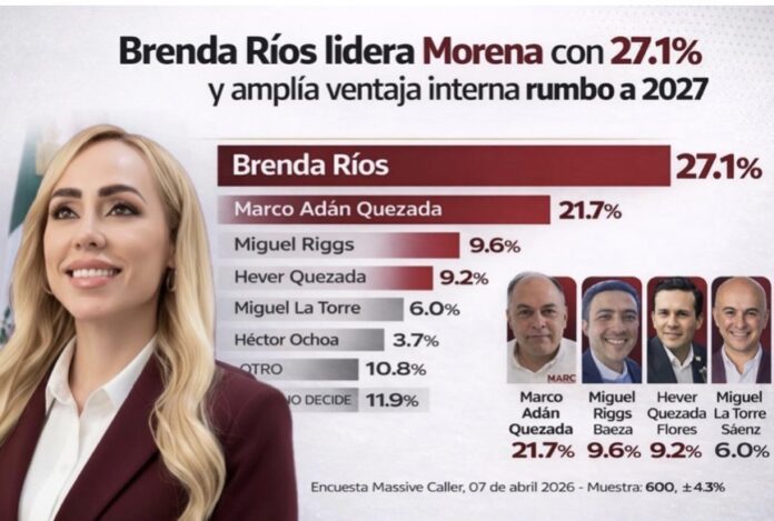 De acuerdo con la más reciente medición de Massive Caller, Ríos alcanza el 27.1% de respaldo entre los aspirantes morenistas, colocándose por encima de sus contendientes y marcando una diferencia significativa en un escenario donde el resto de los perfiles no logra acercarse con la misma fuerza.