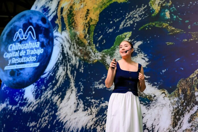 Katya Echazarreta impartió la conferencia “Espacio Sin Límites” impartida en el gimnasio Rodrigo M. Queveo ante estudiantes de nivel medio superior y superior de Chihuahua.