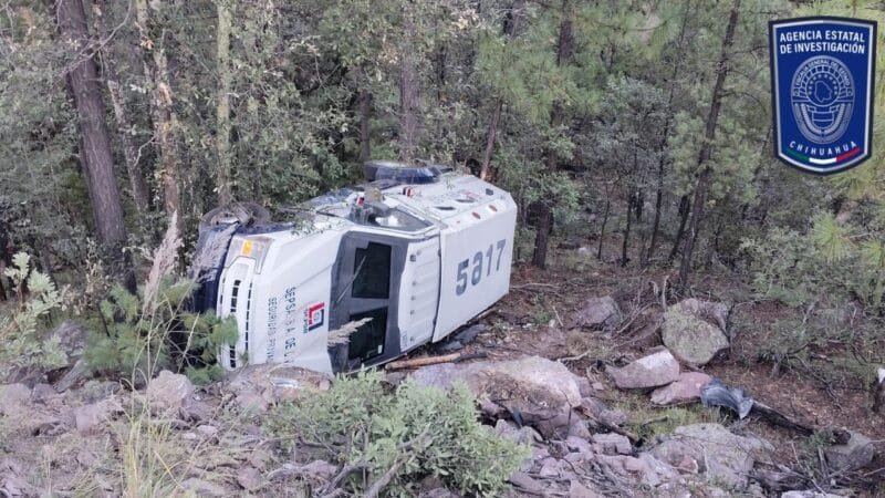 Cuauhtémoc, Chih.- Elementos de la Agencia Estatal de Investigación, adscritos a la Fiscalía de Distrito Zona Occidente, brindaron apoyo de seguridad y vigilancia tras la volcadura de un camión de valores, registrada por la carretera a Basaseachi.