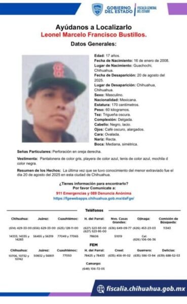 La Fiscalía General del Estado emitió una pesquisa para localizar a Leonel Marcelo Francisco Bustillos, de 17 años, reportado como desaparecido desde el 20 de agosto de 2025 en la ciudad de Chihuahua. La última vez que se tuvo conocimiento de su paradero, vestía pantalón gris, playera azul, tenis del mismo color y llevaba una mochila negra.