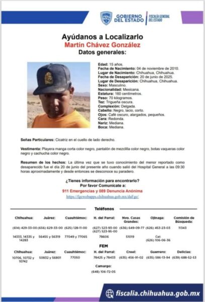 La Fiscalía General del Estado de Chihuahua emitió una ficha de localización para Martín Chávez González, un menor de 15 años que fue reportado como desaparecido el pasado 20 de junio de 2025. La última vez que se le vio fue al salir del Hospital General de la ciudad de Chihuahua, alrededor de las 9:30 de la mañana. Desde entonces, se desconoce su paradero.