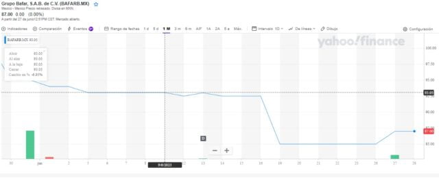 Chihuahua, Chih.- De acuerdo con el portal Yahoo Finance, que muestra información financiera y los precios históricos de las acciones en la Bolsa Mexicana de Valores, del 30 de mayo al 29 de junio, la acción de Grupo Bafar SAB de CV (BAFAB.MX), bajó de un precio de $93.05 a $87 pesos, lo que representa un $6.05 (7%).