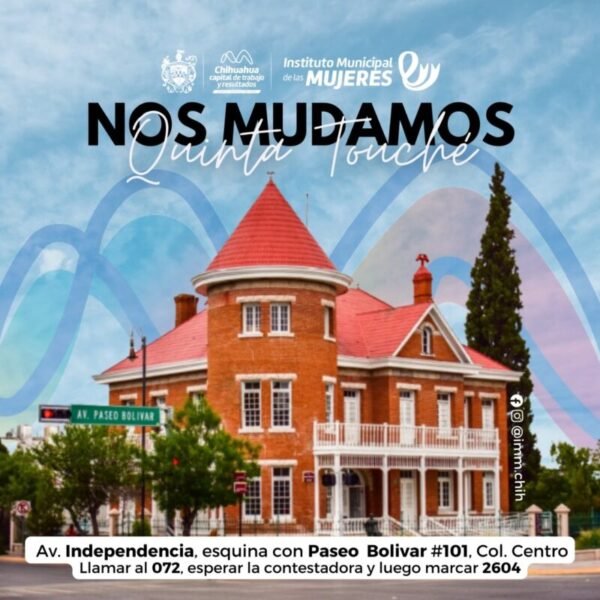 CHIHUAHUA, CHIHUAHUA.- El Instituto Municipal de las Mujeres (IMM) dio a conocer que de forma temporal las instalaciones de la de pendencia se ubicarán en la Quinta Touché, ubicada en Paseo Simón Bolívar 101 en la Zona Centro.