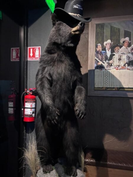 A la derecha, un oso pardo negro, impresionante, con sombrero de guardabosques, se convierte en uno de los elementos más fotografiados del sitio. Es una pieza que impone, sorprende y refuerza la personalidad norteña del concepto.