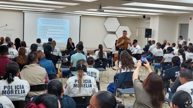 Policías preventivos y personal administrativo del municipio de Morelia, Michoacán, recibieron una capacitación en materia de justicia cívica y mediación policial, por el policía de academia Saúl René Mendoza, instructor del Instituto Superior de Seguridad Chihuahua (ISSCUU) de la Dirección de Seguridad Pública Municipal (DSPM).