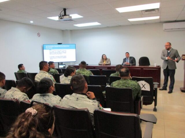 Chihuahua, Chih.- En seguimiento a los acuerdos generados en la Mesa de Seguridad Regional Para la Construcción de la Paz, la Fiscalía de Distrito Zona Sur y la Comisión Estatal de Derechos Humanos (CEDH), brindaron capacitación en materia de derechos humanos a elementos del Ejército Mexicano y la Guardia Nacional.