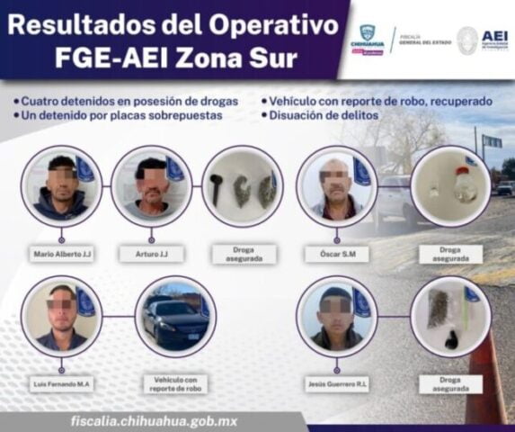 Chihuahua, Chih.- Durante un operativo para disuasión de delitos realizado en Parral y la región, elementos de la Agencia Estatal de Investigación y la Fiscalía de Distrito Zona Sur, capturaron a cuatro sujetos en posesión de drogas y uno en poder de un vehículo con placas sobrepuestas, el cual quedó asegurado.