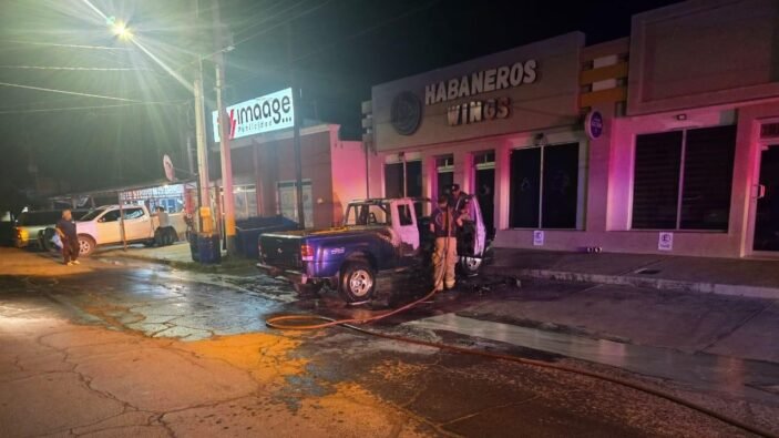 La intervención se llevó a cabo tras un reporte al número de emergencias 9-1-1, en el que alertaba sobre una camioneta Ford Ranger que fue consumida por el fuego y afectaciones en el establecimiento “Habaneros Wings”, ubicado en el cruce de las calles Libertad y 16 de Septiembre, en la colonia Centro.