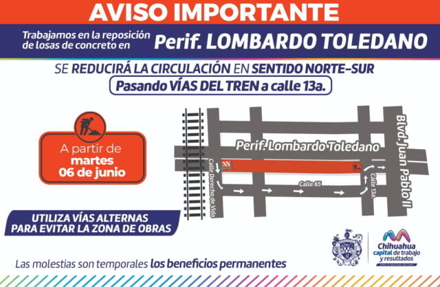 Chihuahua, Chih.- El Gobierno Municipal iniciará a partir del 6 de junio la repavimentación del tramo de norte a sur que comprende desde la calle Derecho de Vida hasta la calle 13, por lo que se pide tomar como vía alterna la calle 65.