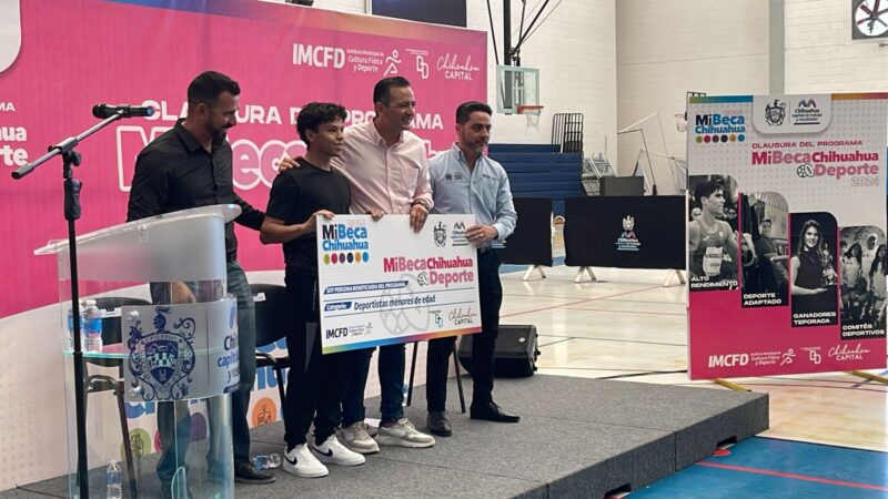 El alcalde, Marco Bonilla, clausuró el programa “Mi Beca Chihuahua Deporte”, estímulo económico que se entrega a las categorías de deportistas menores y mayores de edad que cuenten con competencias mínimas en los Juegos Estatales CONADE, deportistas con discapacidad, entrenadores, ganadores del Premio Municipal a la Excelencia en el Deporte “Teporaca”, promotores deportivos a cargo de la actividad física de una unidad o cancha municipal, comités deportivos y Atletas de alto rendimiento.
