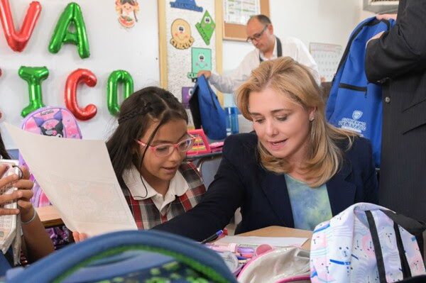 Ciudad Juárez, Chih.- En seguimiento a la estrategia de esta administración, de apoyar la economía de las familias chihuahuenses, la gobernadora Maru Campos compartió refrigerios con las niñas y niños de la Escuela Primaria Estatal Abraham González, de Ciudad Juárez.