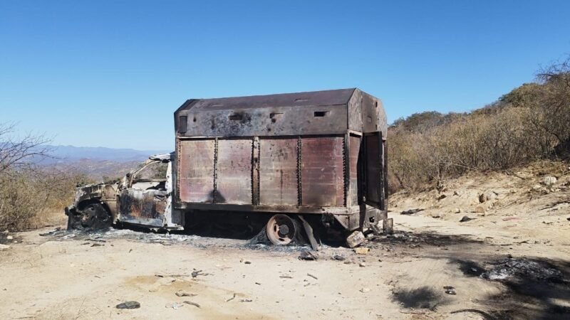 El primero de los vehículos con blindaje artesanal es una pick up de la marca Dodge, línea RAM, con daños totales por incendio; así como una pick up de la marca Ford con impactos de proyectil de arma de fuego y destruida por incendio, en cuyo interior de la caja se encontraron los cuerpos.