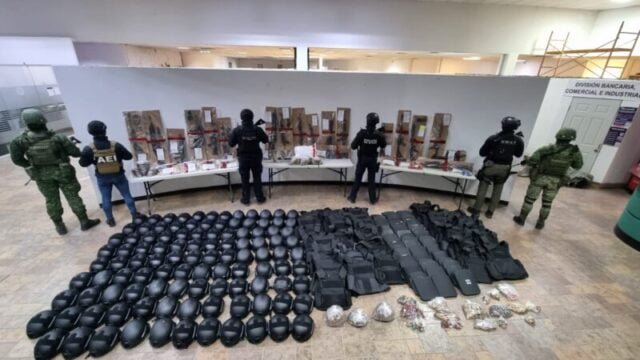 A ellos les aseguraron 13 armas largas, 3 revolver, 3 pistolas, 3 escopetas, 1 subfusil, 1 lanzagranadas, una ametralladora Vickers, 107 cascos balísticos, 65 chalecos tácticos, 147 placas balísticas, rodilleras, coderas, fornituras y uniformes pixelados, 6 mil 96 cartuchos útiles de varios calibres, 101 cargadores para distintas armas de fuego y 2 cintas de eslabón para ametralladora. Además, les confiscaron 5 kilogramos de metanfetaminas distribuidas en 13 bolsas de plástico, sustancias con un valor aproximado de 1 millón 250 mil pesos.