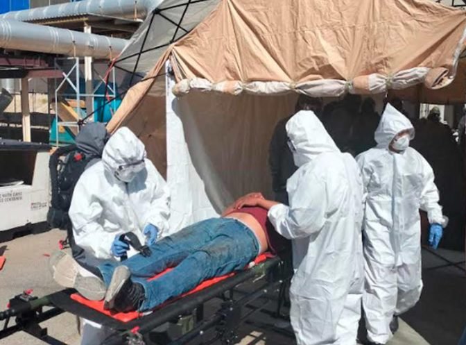 Ciudad Juárez, Chih.- Los ejércitos de México y los Estados Unidos, continúan este jueves con el simulacro de desastre en Ciudad Juárez, y en esta ocasión atienden a la población civil, afectados por el descarrilamiento de un tren con derrame de productos químicos.