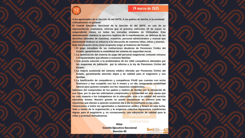 Integrantes del magisterio de la Sección 42 del Sindicato Nacional de Trabajadores de la Educación (SNTE) anunciaron la realización de un paro laboral el miércoles 19 de marzo en todas las escuelas estatales de Chihuahua, con el propósito de manifestarse en la Plaza del Ángel.