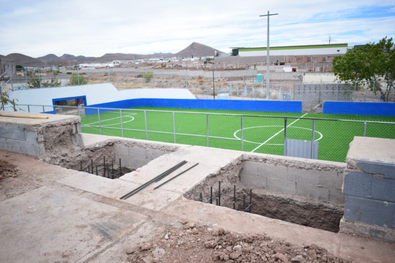 Con una inversión de 2 millones 407 mil 784 pesos se trabaja en la instalación de pasto sintético en una cancha de futbol rápido, donde se colocaron 130 metros de malla ciclónica en el perímetro de la misma, también se re trabaja la rehabilitación de porterías y construcción de una banca para los jugadores.