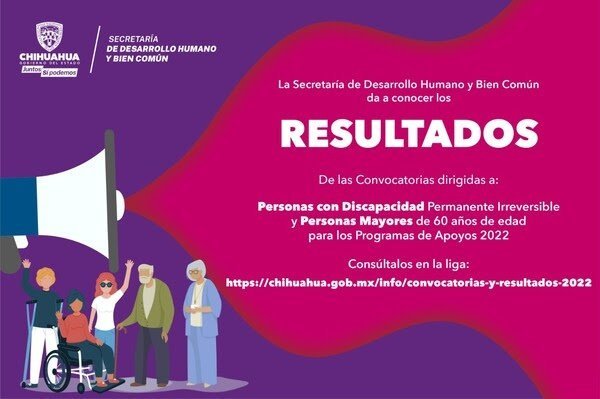 Chihuahua, Chih.- Con el objetivo de mejorar las condiciones de vida de los sectores vulnerables de la población, el Gobierno del Estado por medio de la Secretaría de Desarrollo Humano y Bien Común (SDHyBC), dio a conocer hoy los resultados de las convocatorias en programas de Apoyo a Personas Mayores y a Personas con Discapacidad 2022.