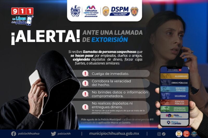 Con el objetivo de prevenir que las y los chihuahuenses sean timados por delincuentes que buscan obtener dinero de manera fácil por medio de llamadas telefónicas con engaños o amenazas, el Gobierno Municipal a través de la Dirección de Seguridad Pública Municipal (DSPM), emite recomendaciones para evitar convertirse en víctima de ellos.