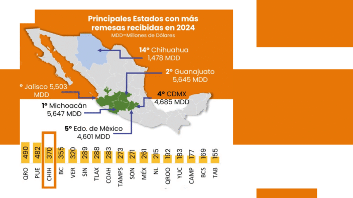 De acuerdo con datos de Banxico y CONAPO, Chihuahua ocupó el lugar número 14 en remesas recibidas en el país durante el año, con un total de mil 478 millones de dólares, lo que equivale a 370 dólares per cápita. La entidad se ubicó en el lugar 18 nacional en cuanto a remesas por habitante.