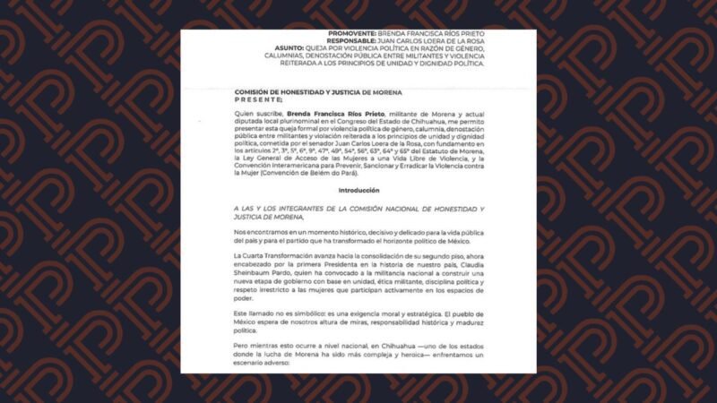 La diputada local por Morena, Brenda Ríos, presentó una queja formal ante la Comisión Nacional de Honestidad y Justicia de su partido en contra del senador Juan Carlos Loera. La legisladora argumentó que fue objeto de ataques y calumnias por parte del senador, los cuales calificó como sistemáticos y sin fundamento.