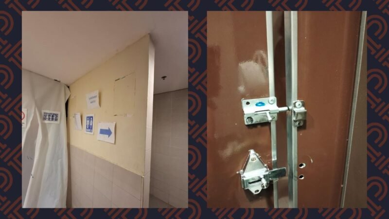 De acuerdo con las quejas, el sanitario destinado a mujeres no cierra correctamente, mientras que el de hombres está dividido únicamente por una cortina.