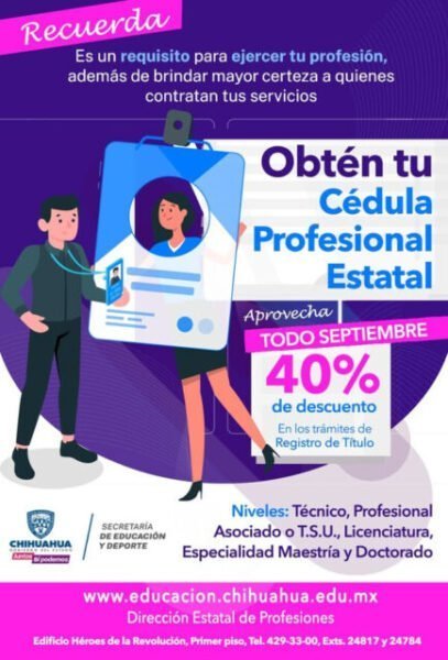 Chihuahua, Chih.- La Secretaría de Educación y Deporte (SEyD) informa que durante el mes de septiembre se ofrecerá un descuento del 40 por ciento en los trámites de registro de título y expedición de la Cédula Profesional Estatal, gracias a las gestiones realizadas ante la Secretaría de Hacienda.