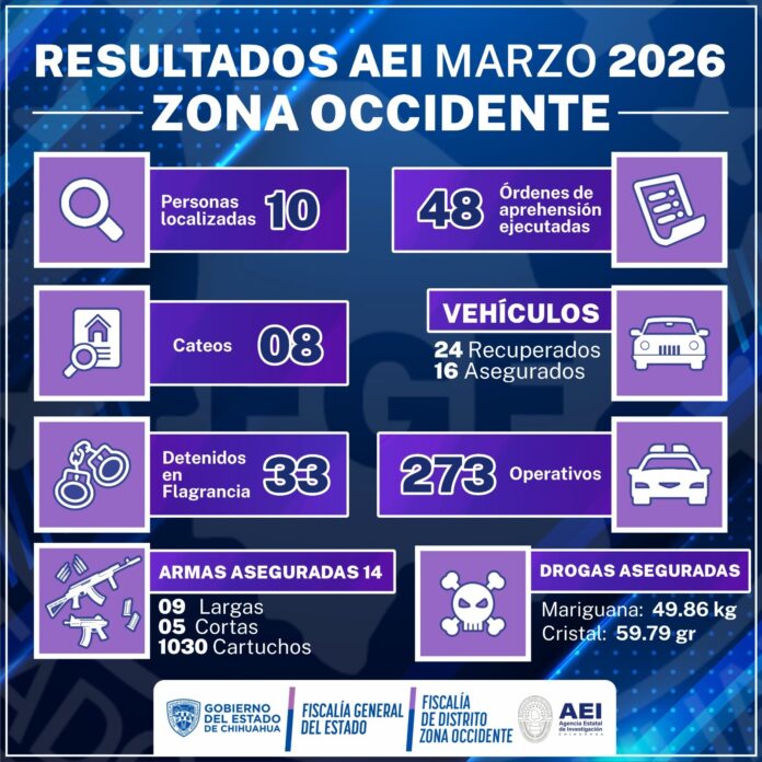 La Agencia Estatal de Investigación en la Zona Occidente dio a conocer los resultados obtenidos durante el mes de marzo del 2026, en el que destaca la detención de 81 personas, de las cuales 48 fueron mediante órdenes de aprehensión.