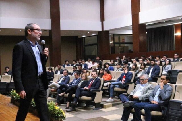La conferencia fue organizada por la UAG y el Instituto Mexicano de Ejecutivos de Finanzas (IMEF) y se realizó en el Auditorio “Dr. Luis Garibay” de la institución educativa con el objetivo de enseñar a los jóvenes los avances de la tecnología y el manejo de los negocios.